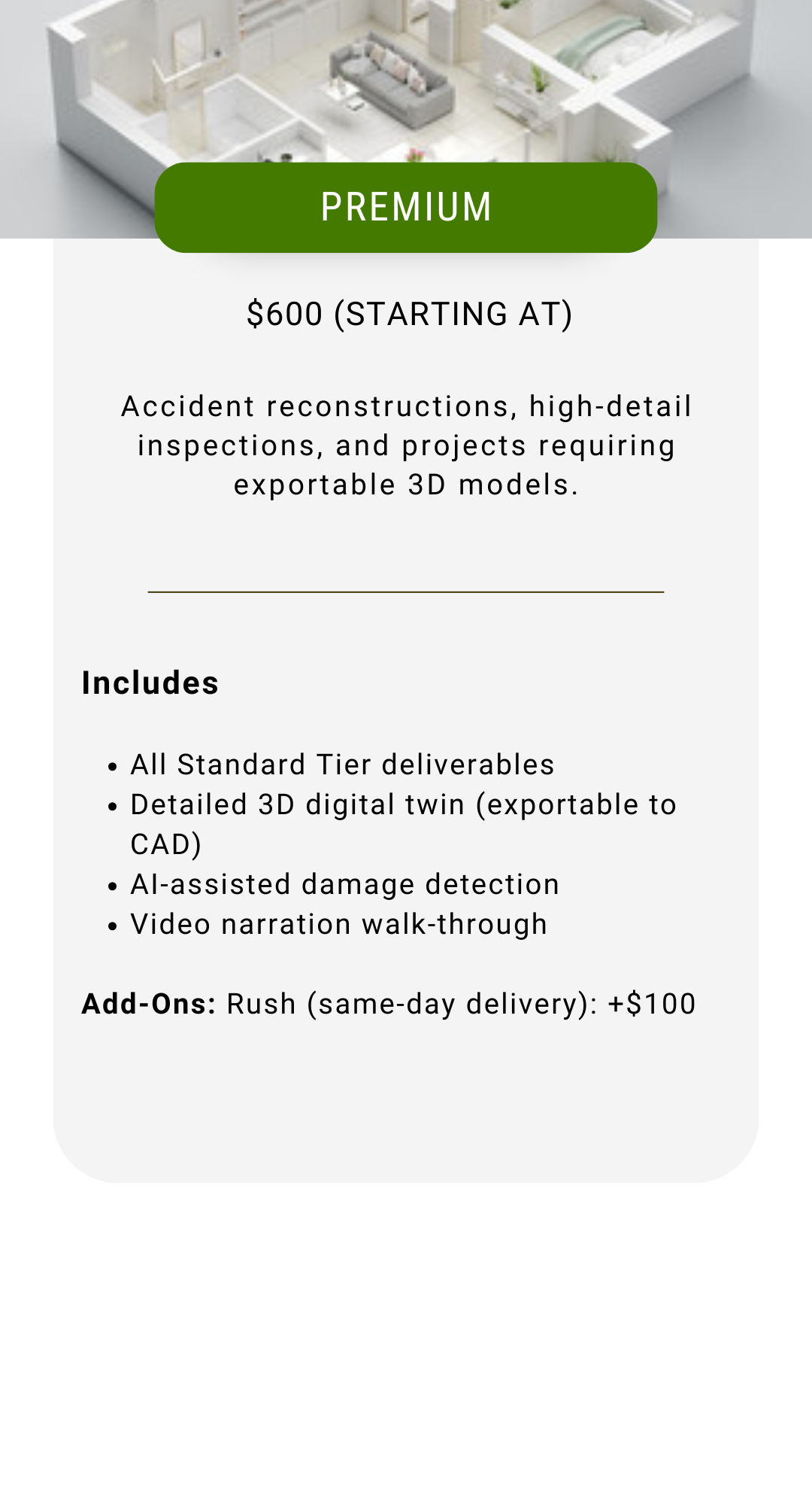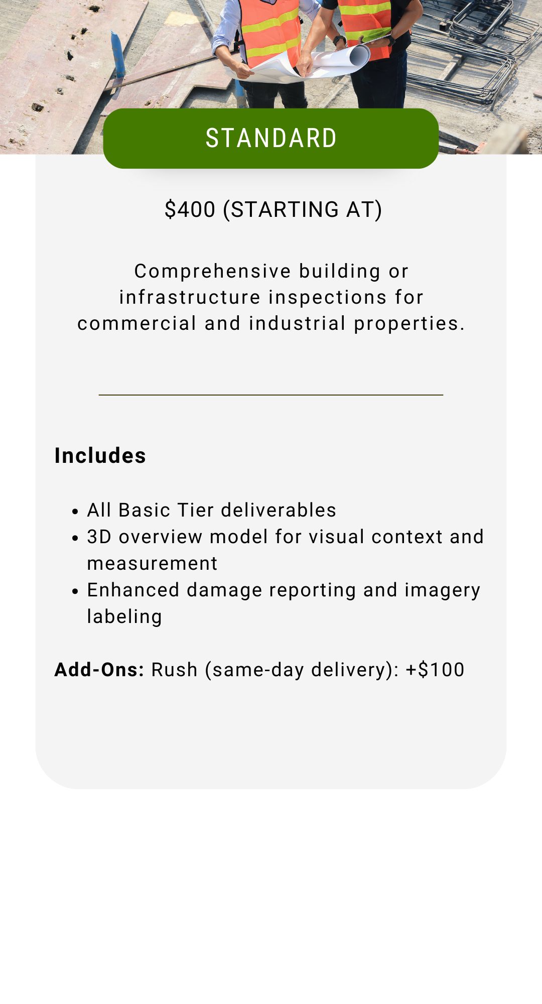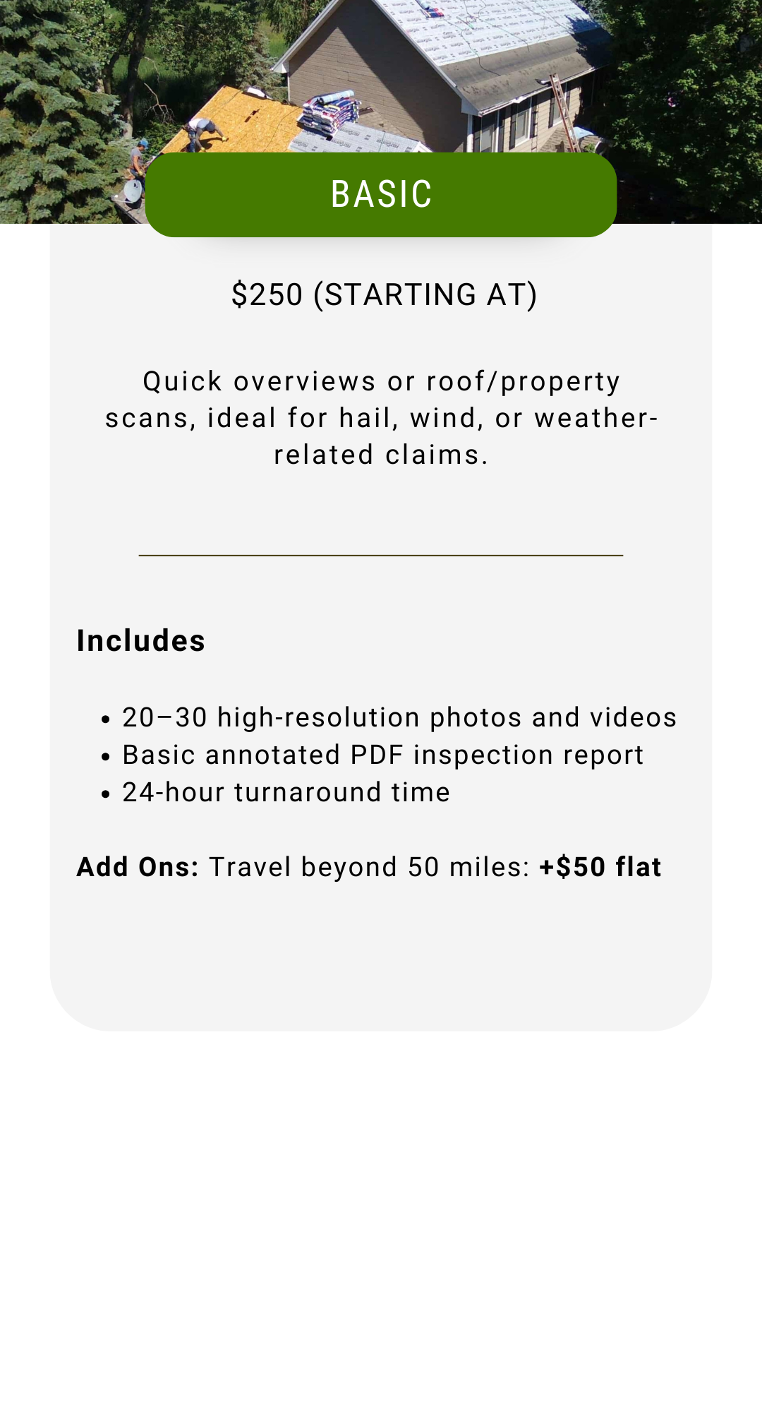 Our inspection services are quoted on a per-project basis due to the unique scope of each job, but start at the base rates above