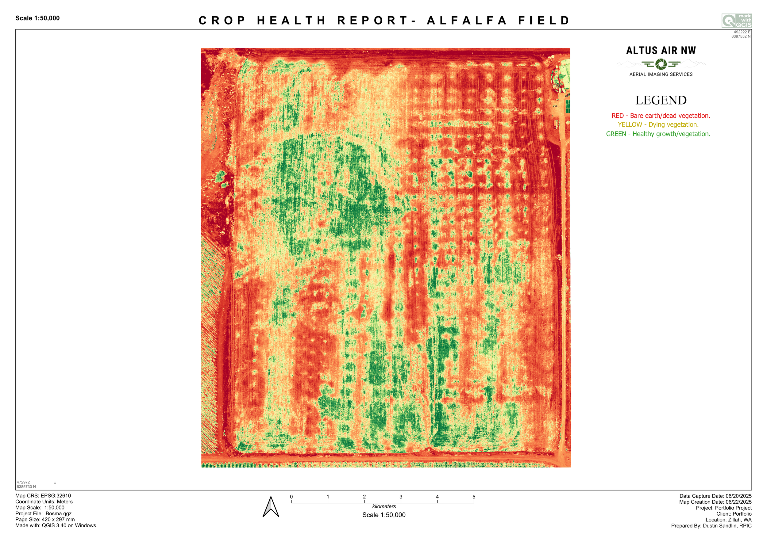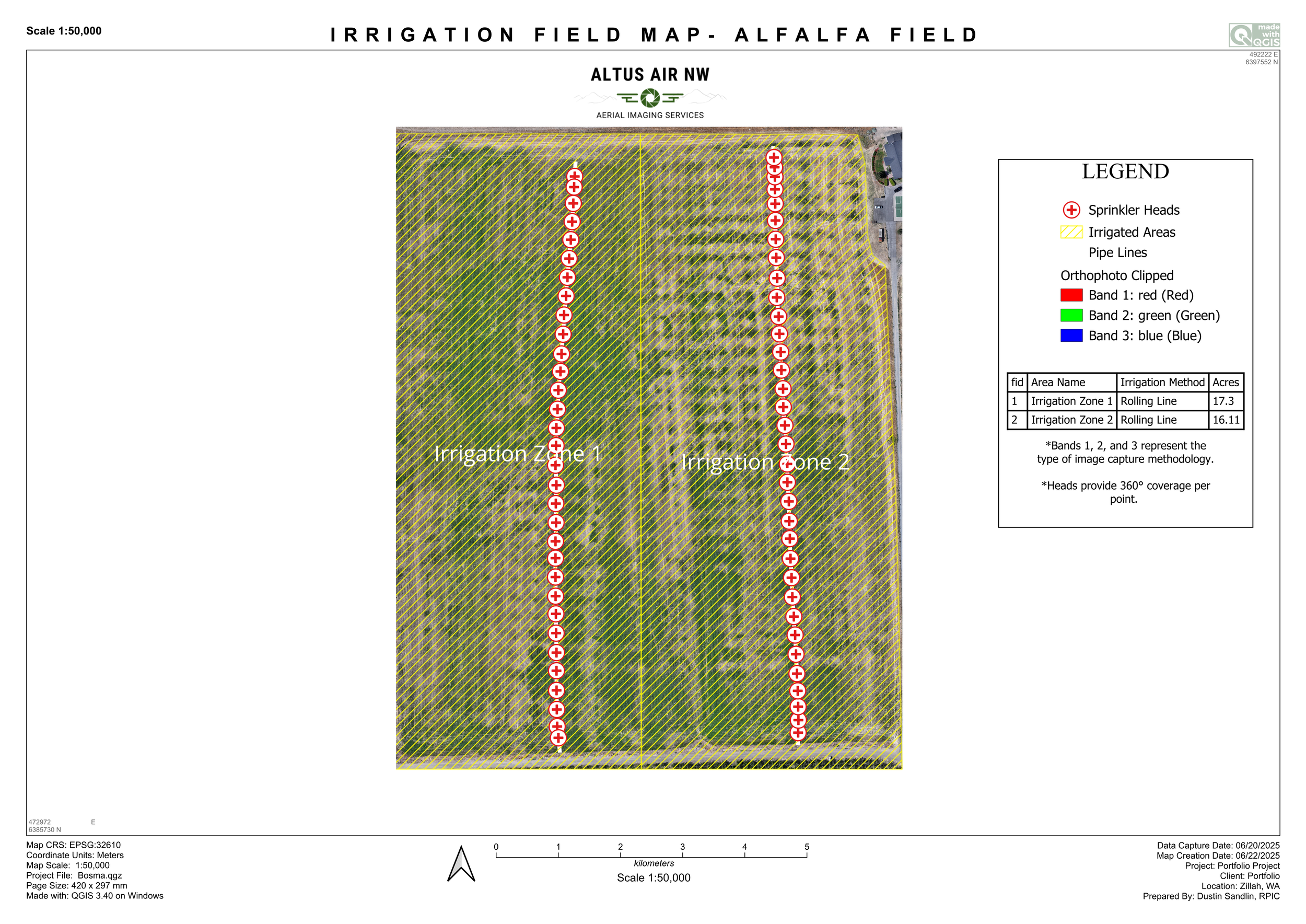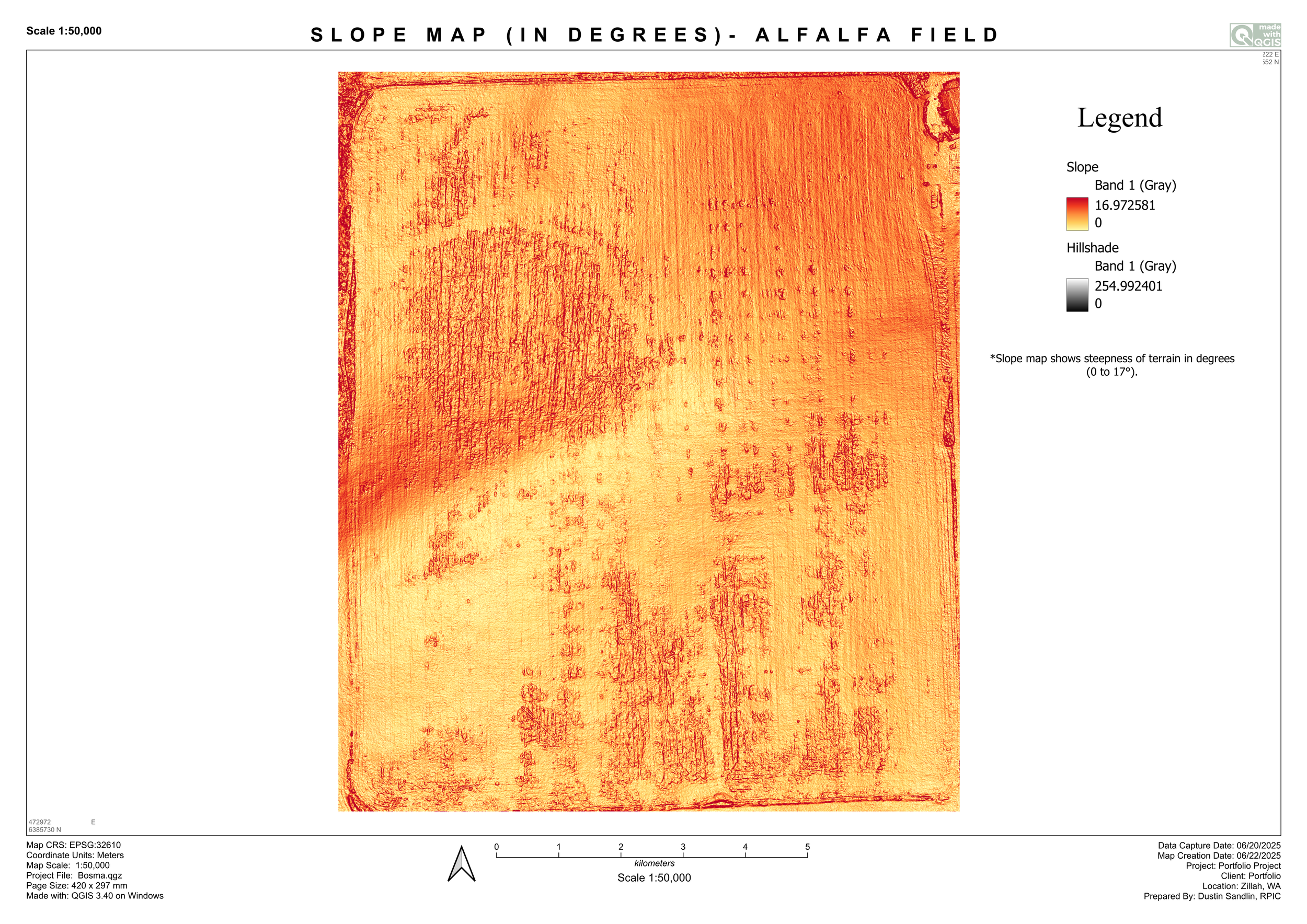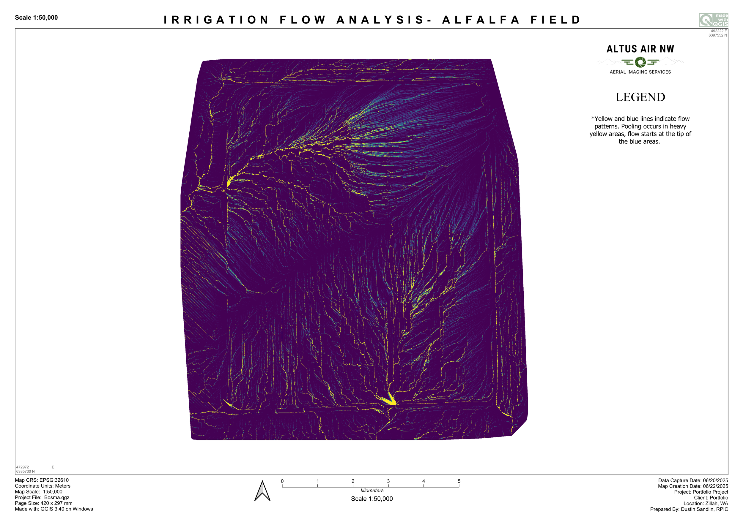 For an alfalfa farm in Zillah, WA, we created a detailed mapping report to improve crop management and irrigation. Our workflows included visual crop health analysis using RGB imagery, a digital irrigation map, and flow analysis to detect inefficiencies. Deliverables included an orthomosaic map, DSM, slope and aspect maps, and contour lines, giving the client clear data to boost yields and maximize water efficiency.